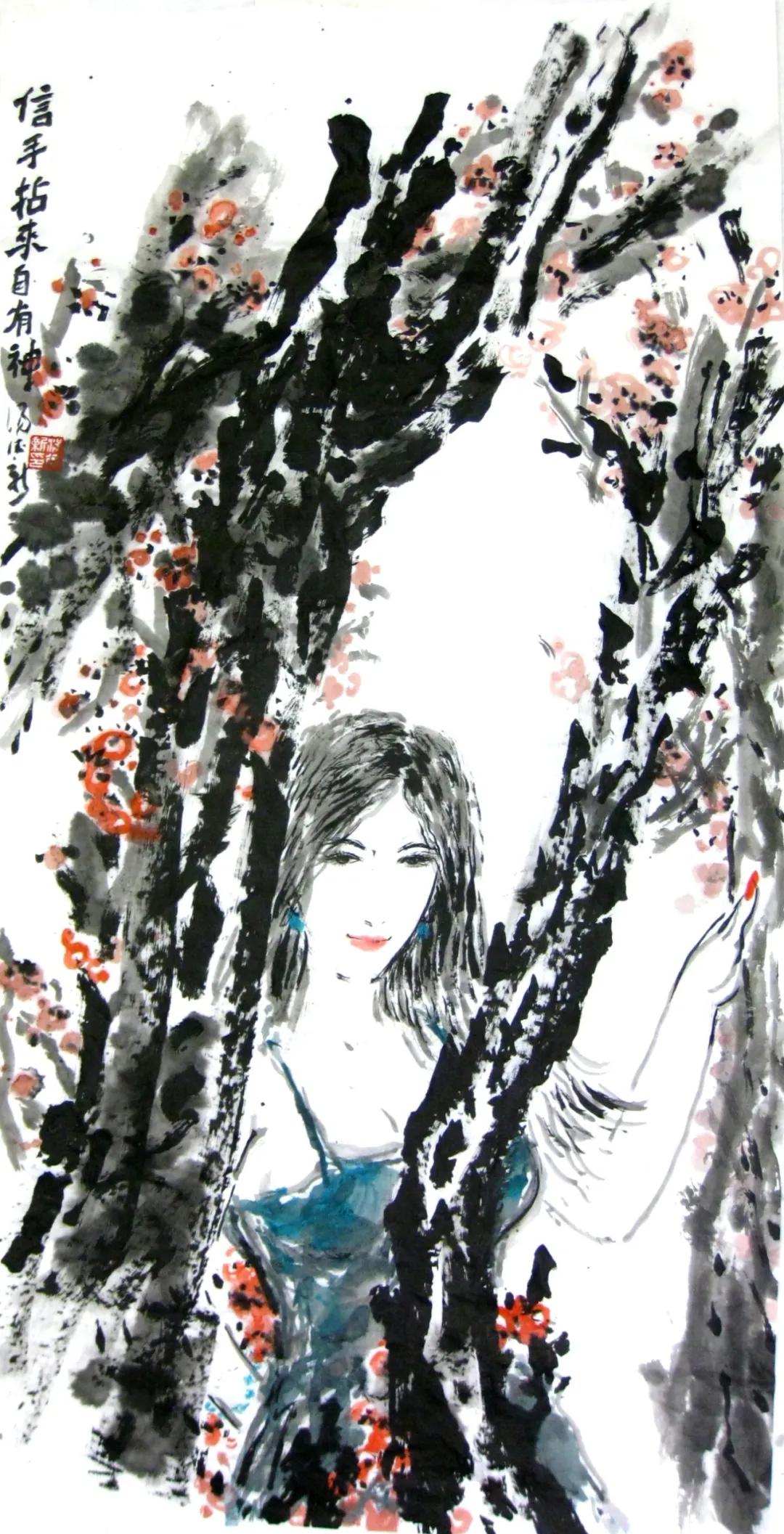 写意的中国画,按照国学大师王国维先生讲就是境界,这是王国维对创新传统艺术的一大理论创建。传承,传统的,也就是意境说的中国画如何进了现当代,美国纽约画院副院长汤德新的写意画十分映照了王国维的艺术理论创新说。话还是回到我为何如此推重汤徳新的写意中国画上,按照艺术的本意是不分传统与现代的,只有画家本身有很好的艺术素养,创作作品时思绪是纵横古今中外的,形式更是思绪的语言倾情,如同音乐的和声学,一个好的作曲家,他在创作时,究竟是先有调,还是先有和声,答案是一致的。汤徳新的绘画艺术我在他的微信空间中展示时,我感觉到非常交响,当汤徳新表现现代美术素描功力的人物写真时,我真切地感受到汤徳新接受的良好的美术基本功,用我们的专门语言来讲就是学院派的美术,汤德新在创作这些写生人物时,十分地抓住了人的内心的韵味,用一种写的对话与被写生的人物在交流,升华的学院派美朮严谨的写真,意在像先,把现代人那种宽怀,崇尚艺术美的心情画的那么有人文韵味。