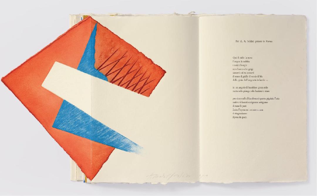由意大利当代艺术家Arnaldo Pomodoro创作的手制书《玫瑰与天空之喜悦》,正文主体是意大利诗人Attilio Bertolucci 的诗作,辅以Arnaldo Pomodoro本人的4幅版画作品。四幅版画作品几乎集合了所有Pomodoro在创作中常用的元素:球体、棱角、大地的肌理、箭头、锯齿等。