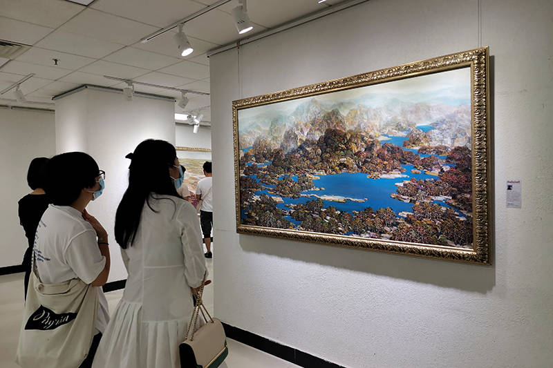 前来观展的市民方女士一边欣赏画作,一边拍照纪念。她告诉记者,此次展出的油画风格多元,有宏大的历史伟人题材,也有生活朴实无华的劳动人民,作品独特的“金属晶体”表达形式,让人眼前一亮。