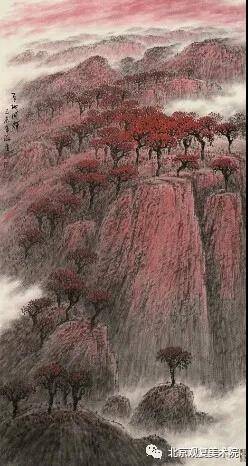 他的《天地同辉》、《老区秋色》、《江山万里浩然气》、《红叶漫九州》、《江山万里叶正红》、《太行秋韵》、《和谐之春》、《云山万里》等作品大多都是巨幅之作。都表现了祖国的山美、水美、人美,人与自然的和谐。可见作者对祖国大好河山的热爱及胸有万壑的情怀,他的画面虚实相生,苍润相生,开合有度、彩墨交融、书法用笔、顿挫有力、风舞云动、气势雄浑、山之壮观、水之清幽、云之缭绕、树之挺拔,可以看出他继承了李可染大师的雄浑厚重,大家王文芳先生倡导的“三美”理念,现已形成了他大气如宏,高阔厚重,笔墨生动的个人风格。