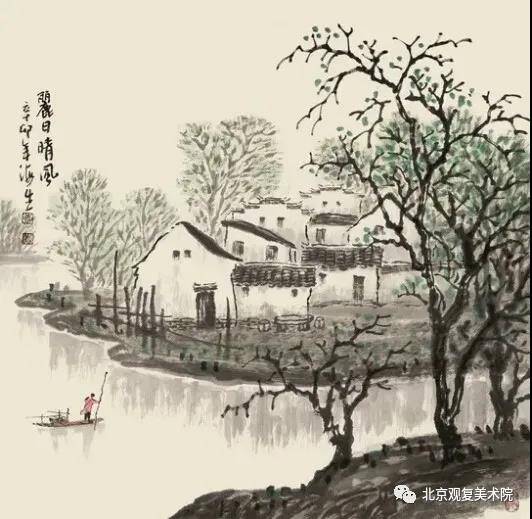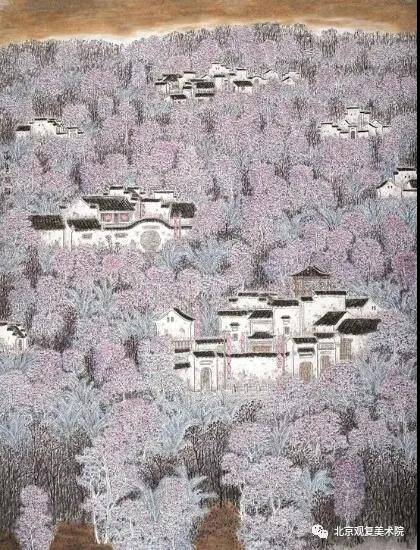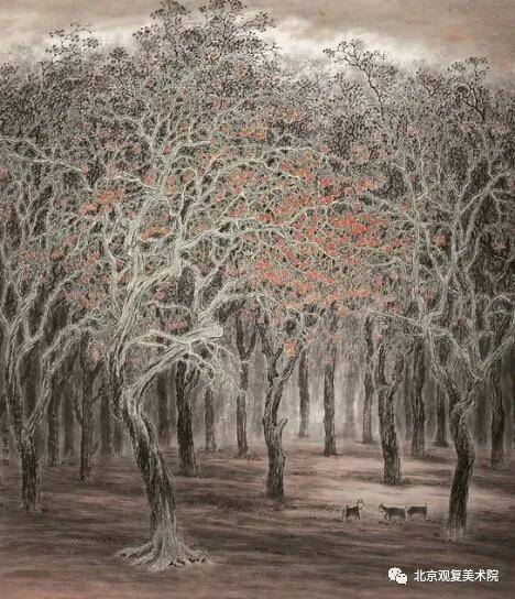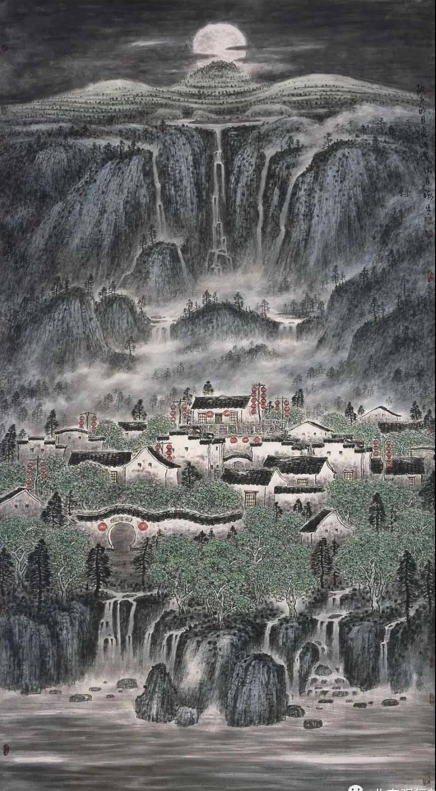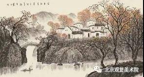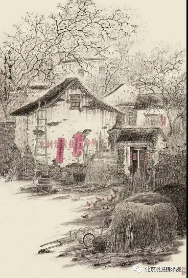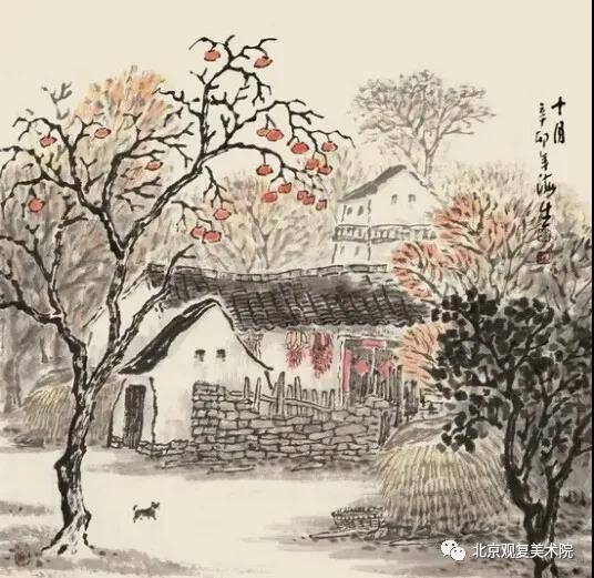他的田园乡村风格的作品,表现的更是细腻、多情。如《山林茫茫醉秋风》、《金风和畅》、《我的老家》、《三阳开泰》、《香飘十月》、《忘不了的老家》、《乡恋》、《朝晖》等作品。构图、意境、笔墨都很美,也是他传统功底及个人理念的集中体现,充分利用水墨色彩表现景物。那民居、树木、草垛、院墙、篱笆、农具等,表现的高低有致、疏密相间、黑白对比、相映成趣、淋漓尽致。