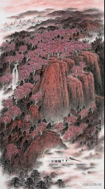 如作品《气贯长虹》时隐时现的长城,重重叠叠的山峦,飘渺飞动的云雾,高低有致的树丛,主体与配景表现的相映得当,宛如一条巨龙在朝霞映红的群山峻岭中飞翔。真可谓:群山万里长龙舞,大江南北祥云飞。天地有万象,天地有大美,壮观!又如《中华魂》也是表现长城的作品。