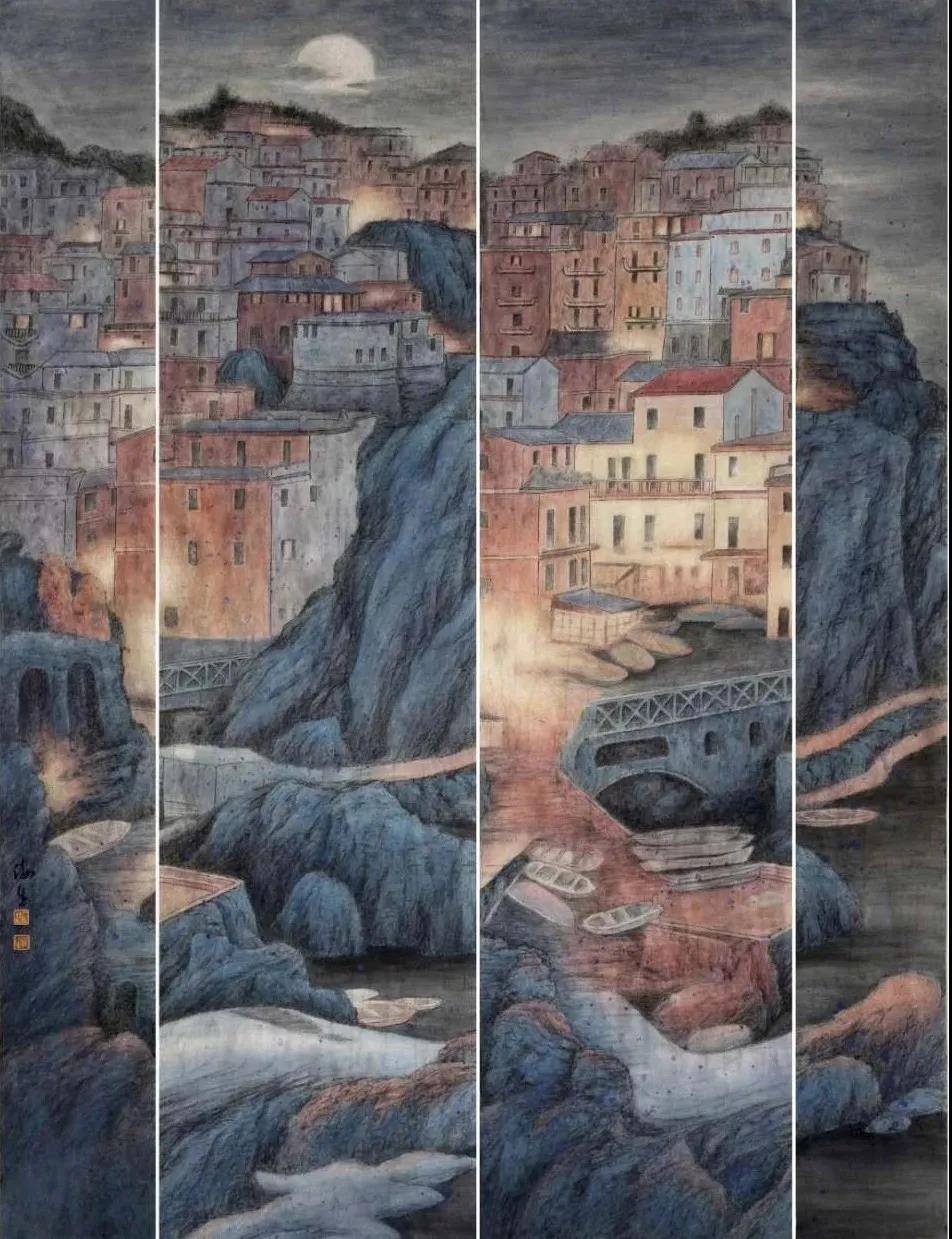 我问他为什么能想起这种表现形式?他说我长期写生观察山石的结构及肌理,结合现代理念,又因中国画讲究阴阳,也就是凹凸。那么一幅山水画里面,也就是大凹凸之内有小凹凸,笔墨随时代要有继承和创新!李海生老师由于底子厚、功夫深、为人低调、厚道,善于专研,澄怀悟道,苦心修炼,已从物象变为心象,他描绘的物象都升华到了思想、精神及情感的高度。