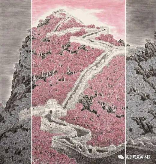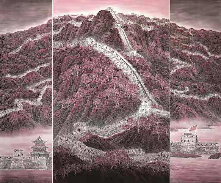 我看过多位老师画过的长城,但都是大同小异,从未见过他这样的表现形式。他运用了现代构成的理念,把老龙头长城,金山岭长城,八达岭长城,嘉峪关长城等巧妙地结合到一幅画上,既表现了长城的雄伟气势,又表现了长城的完整性,实乃倾心巨制、大气厚重、面目新颖、耐人寻味。可以感受到作者在力图通过绘画语言尽心尽力地表达对中华民族精神的赞美。让人想到了万里雄关,想到了金戈铁马的古战场及当年抗日战争前线的烽火。让人顿时增添豪情,催人奋进,给人力量。