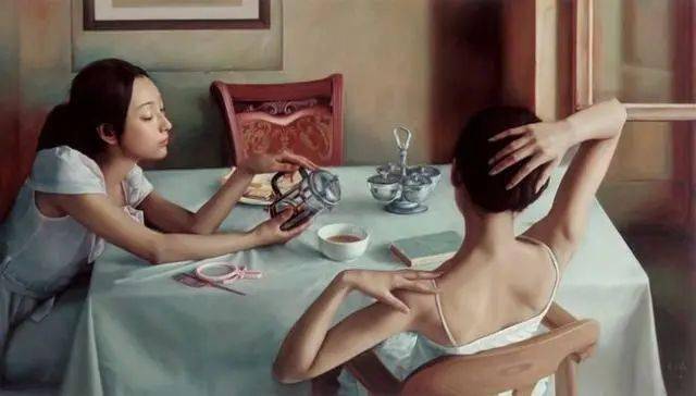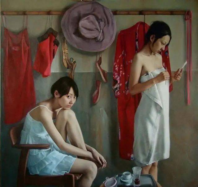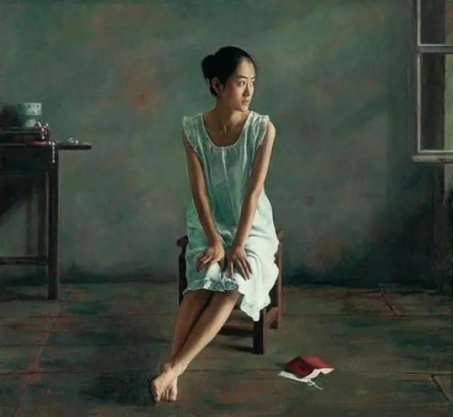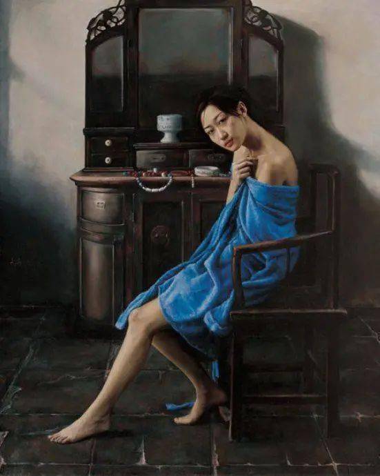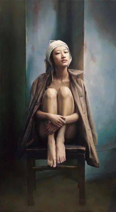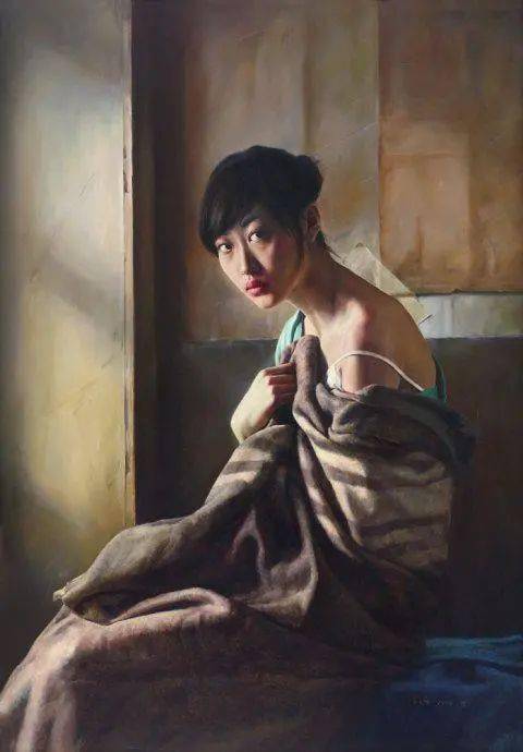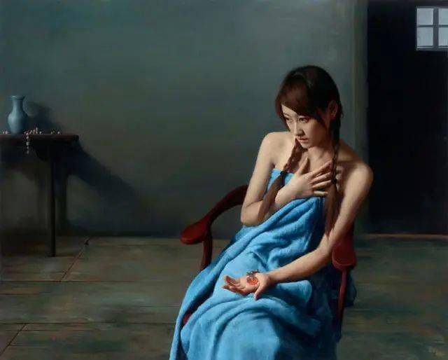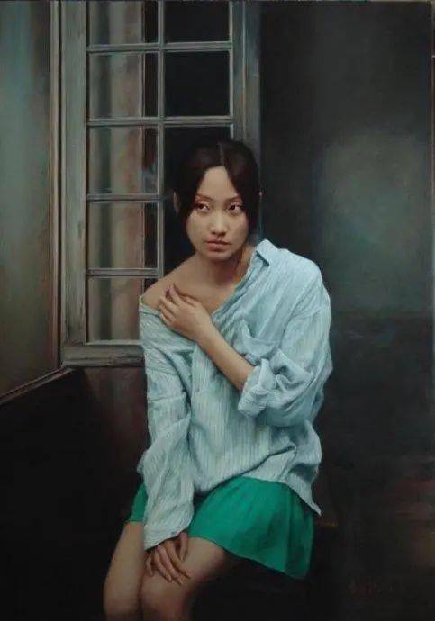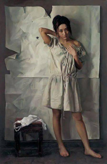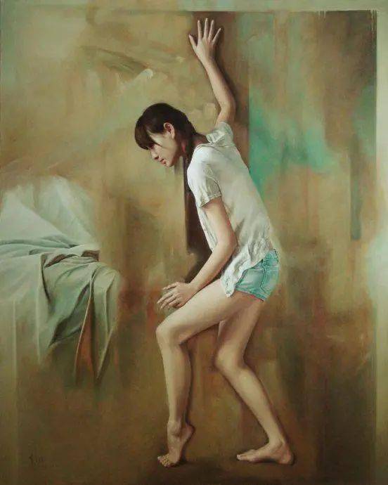 在当代绘画中,“写实”而不再是“写实主义”,我用“得之不易”的形象来表达青年画家写实性作品的感受,李文涛的作品《惑》,画中的少女不是处在一个现实生活中的空间,而是出在一个抽象省的错位空间中,她似乎被吸附在墙上,有似乎站立在地上,与前方的床或者沙发出在不同的空间中。这表明青年画家的作品仍然保有古典主义绘画对于观众的心里的感动,即对于人生经验的交流与共鸣。在李文涛的作品中,画面的主体多为那些面容姣好的少女形态,借由她们,艺术家表达了对过往时光的怀念和渴望回归的心里。