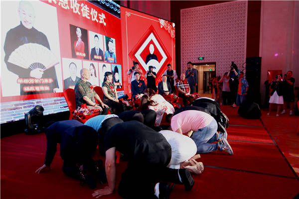 弟子向恩师献花中国传统文艺界不同其他行业,对于收徒仪式它有着不成文的规矩。师父在收徒前,还要有“引师”、“保师”及“代师”。所谓引师是将徒弟引荐给即将收徒的师父;保师就是要向师父及观众保证徒弟的人品;代师是由于某种原因师父无法继续传授技艺给徒弟时,可由代师来代替师父。在杨永恩先生收徒现场,我们又见证了这一传统仪式。 现场师徒、 引师、保师、代师上台, 引师为香港影星林威、保师为著名导演尤小刚、代师为著名相声表演艺术家陈寒柏,拜师帖、师训、徒弟向师父赠礼及行跪拜礼并敬茶,并向 引师、保师、代师三鞠躬,立誓诚心诚意传承弘扬文化艺术,师父对徒弟殷切叮咛,同门师徒合影,传统的拜师仪式流程引人注目,让人感受的深厚的文化底蕴。