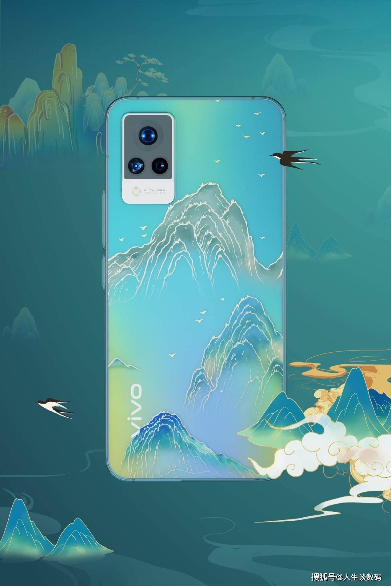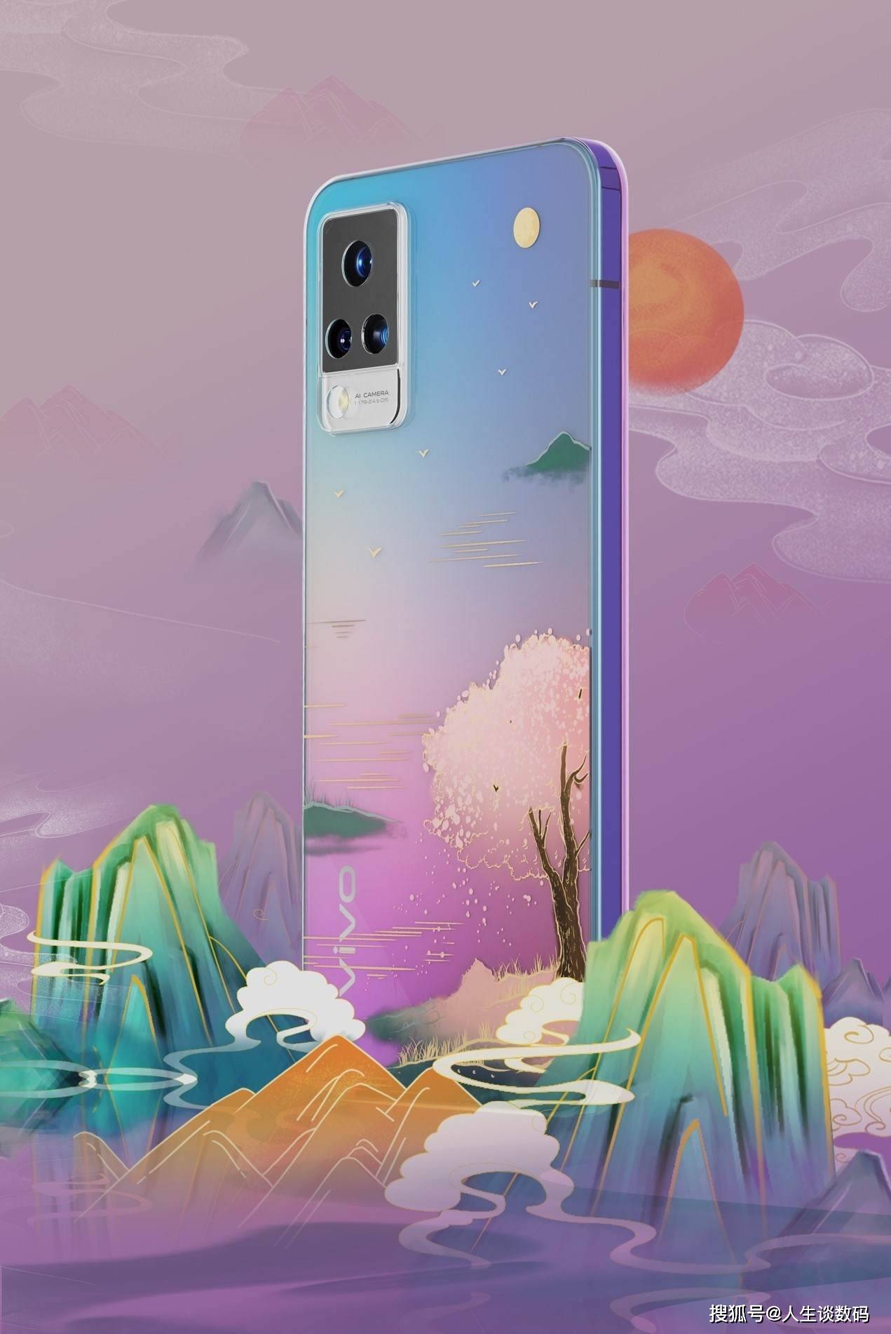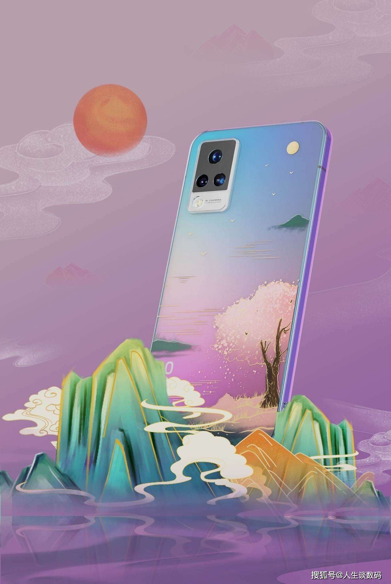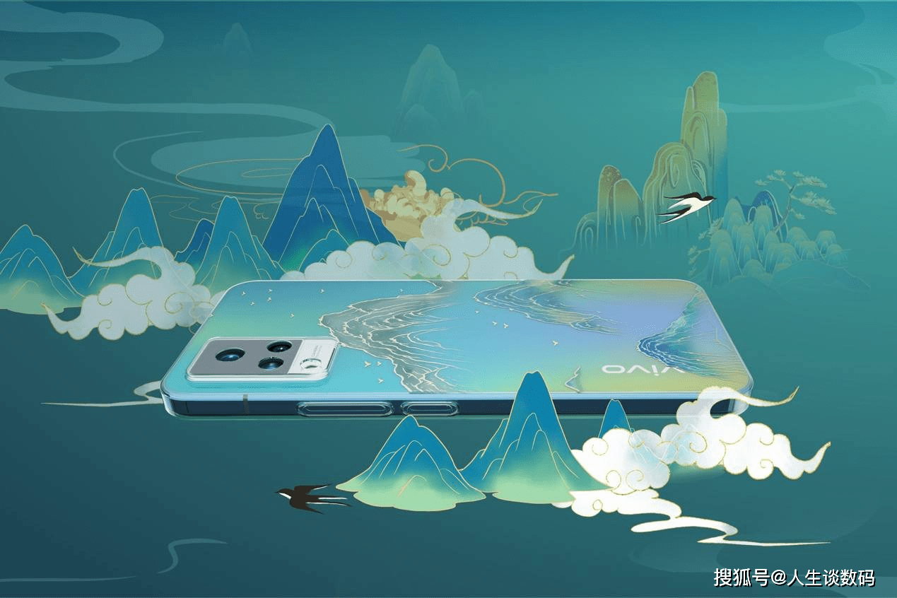 这副作品的创作灵感来源于《千里江山图》,机身蓝绿色系的光影效果同这幅画作的画风基调相得益彰,再加上一抹浩渺的淡紫色烟雾,在炎炎夏日给人清凉之感。后盖镜头模组的搭配也并不突兀,三角排列的摄像头在画作中仿佛充当了日月星。