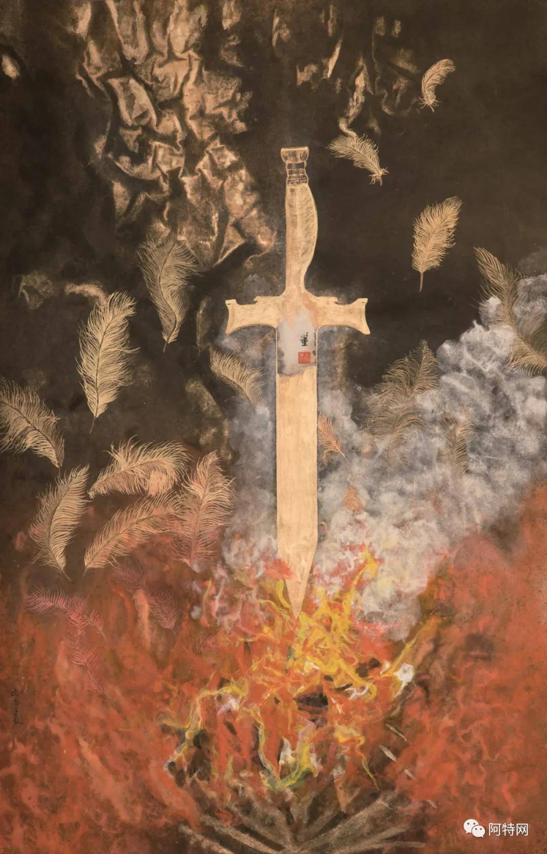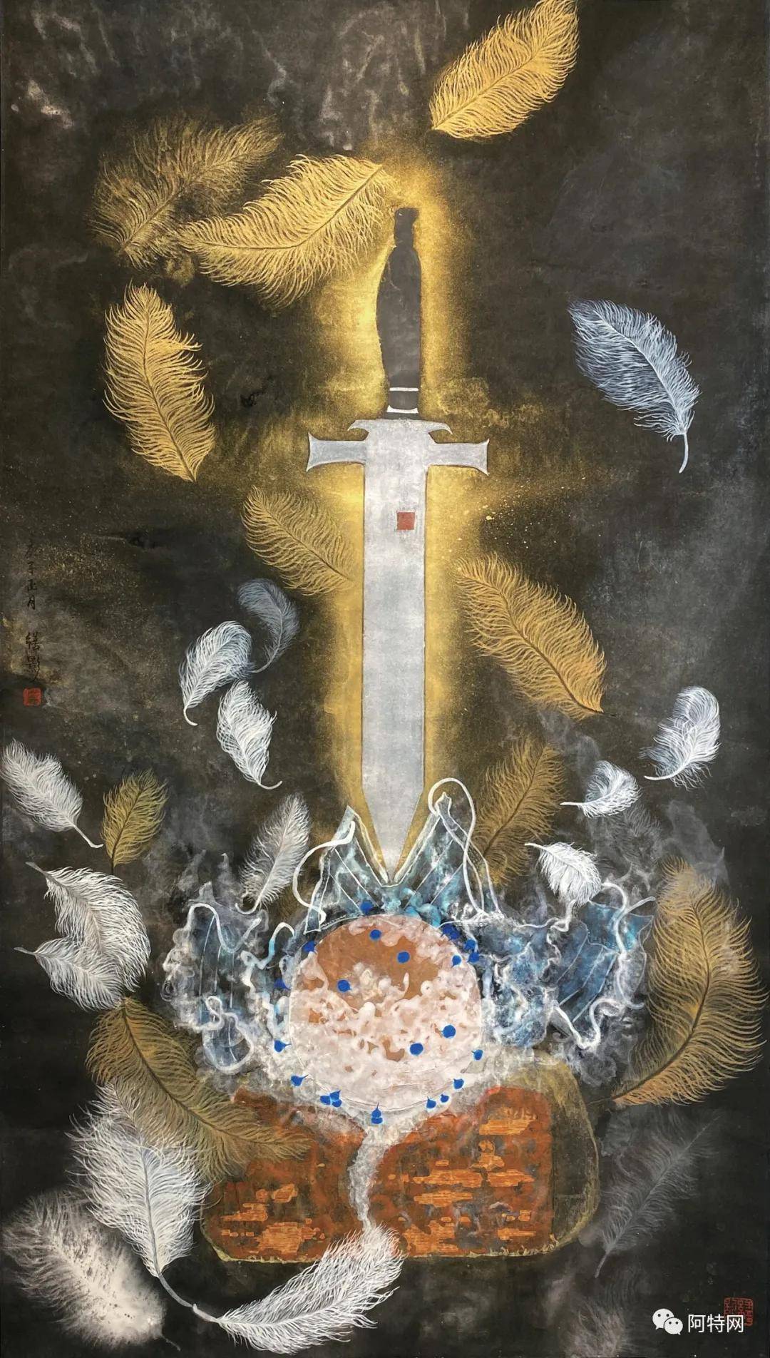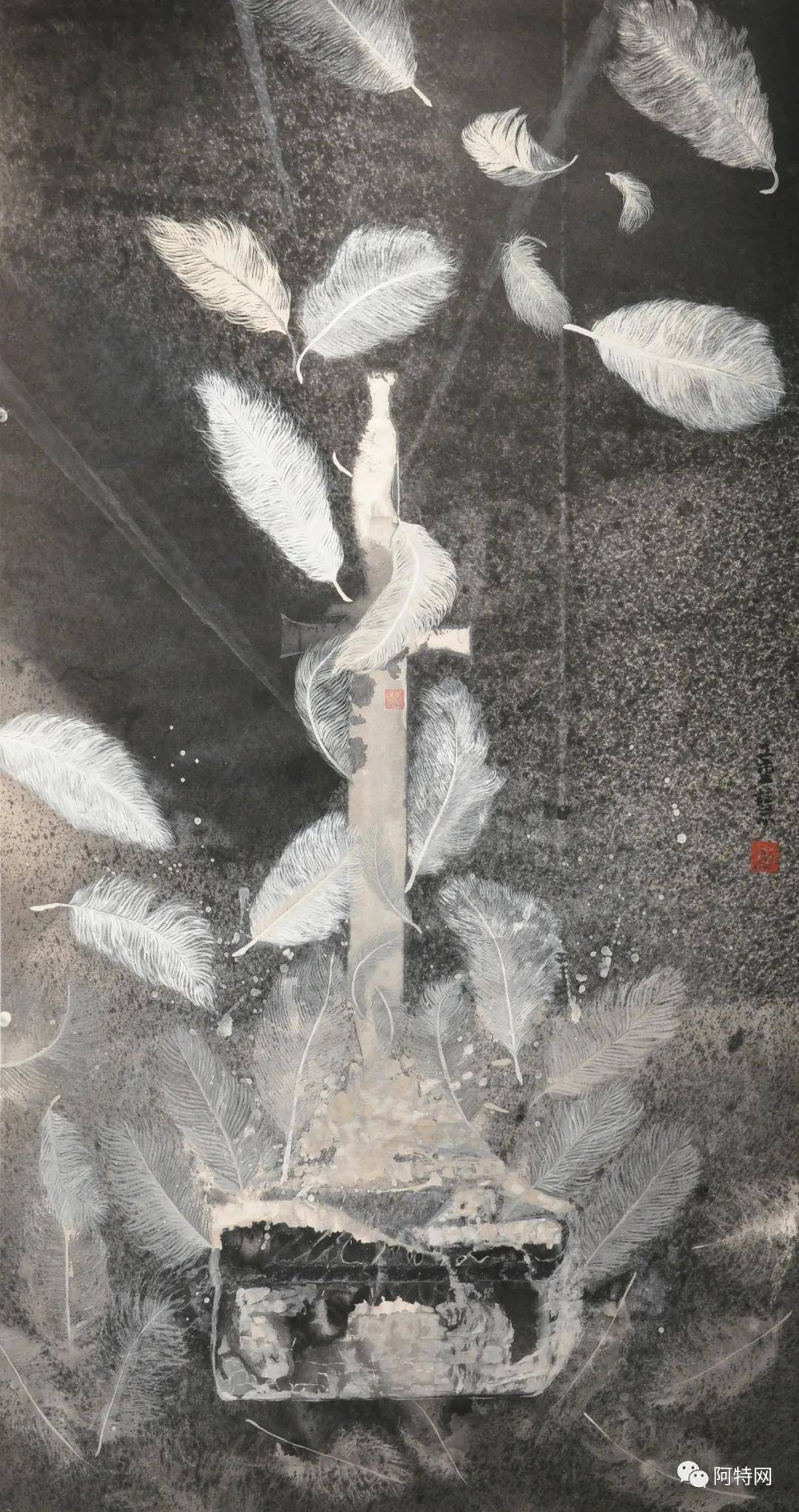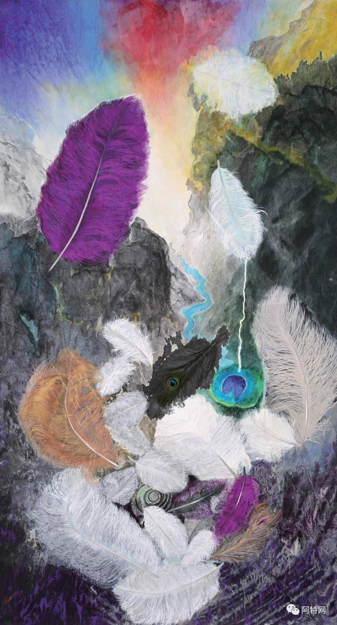 董慧的绘画创作,乍看起来还是很唯美的,既灿若夏花,又像秋水流丹,极尽自然之绚烂。特别是充溢在画面中的那些宝石蓝和枫叶红,以及丰富的墨痕机理,实在令人陶醉,百看而不厌。当然,在这绚烂的深处,还有一种深邃的存在。特别是那些飘荡翻飞的羽毛,或说那些飘荡翻飞的落叶,倒是给人以凝重的感觉。让人感觉到了时空的深度与厚度。既绚烂又凝重,既优美又深邃,这就是画家董慧的艺术特质和审美独特性。